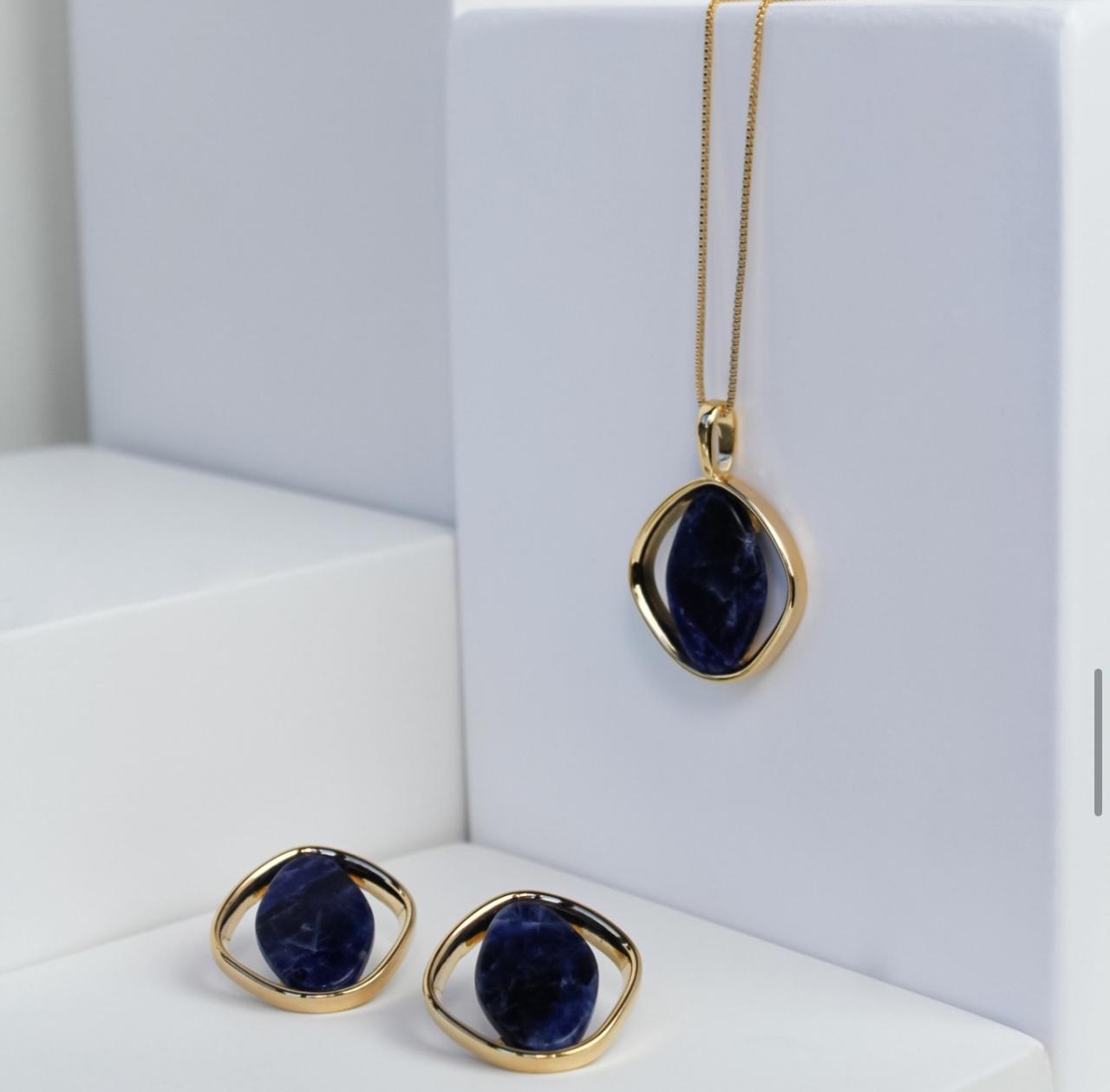 - Pedra Natural Profunda: A gema central (provavelmente Sodalita ou Lápis-Lazúli) em um tom intenso de azul-marinho marmorizado, confere um toque de sofisticação e mistério.
