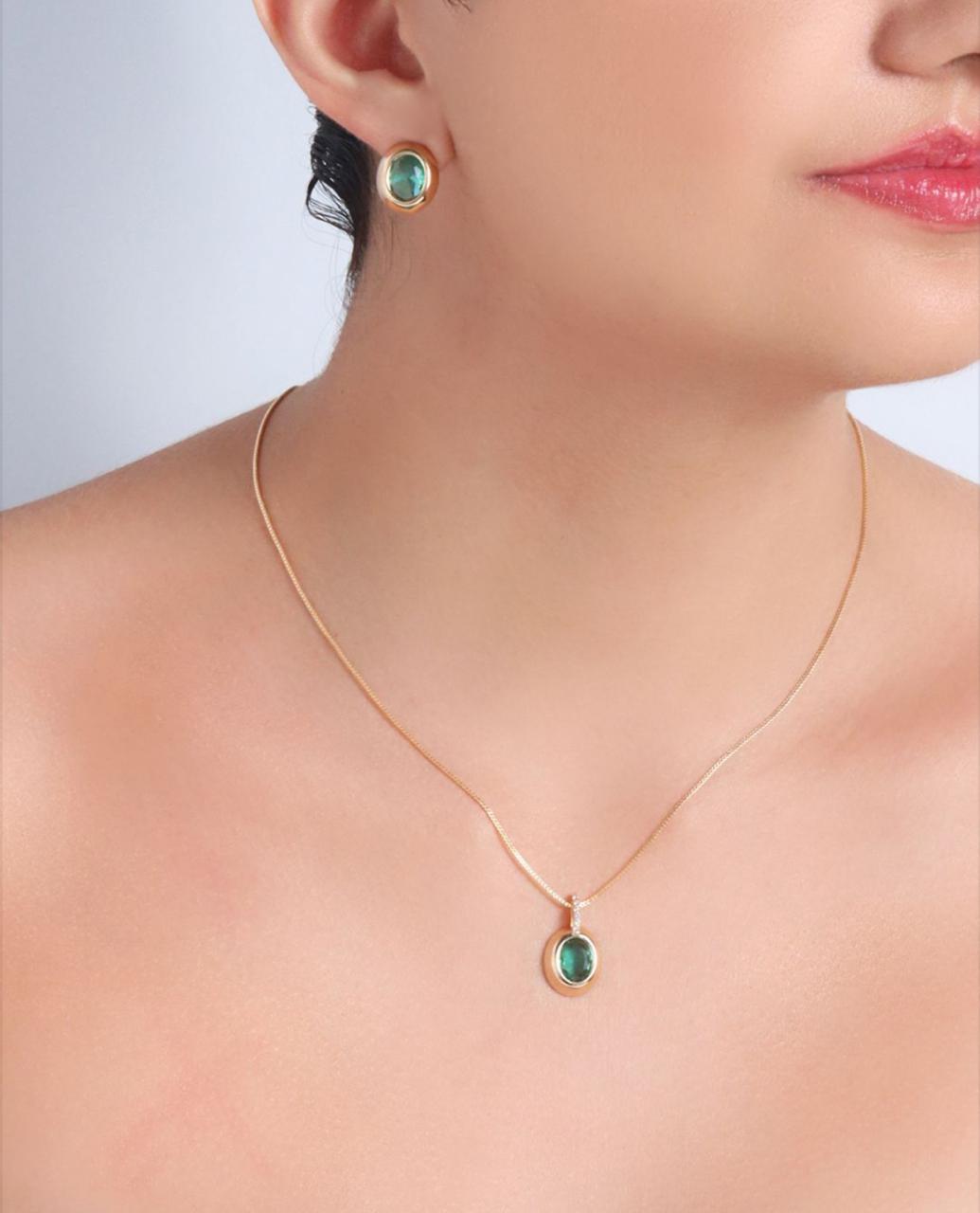 - Design Clássico e Atemporal: O conjunto é composto por um colar elegante e brincos tipo stud (botão), ambos apresentando uma linda gema oval verde emoldurada em metal dourado.